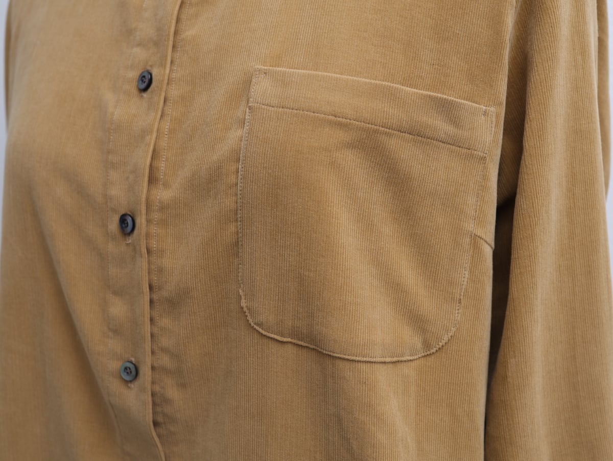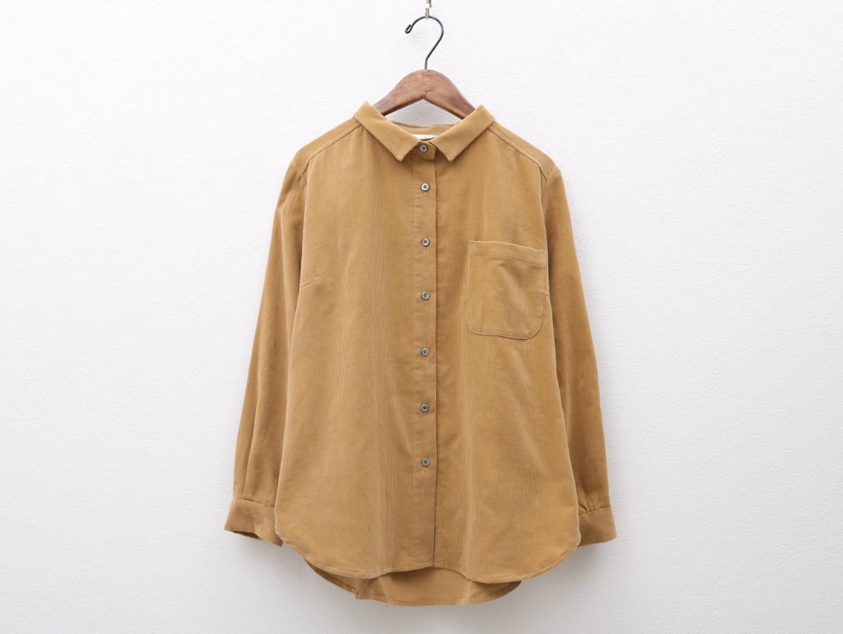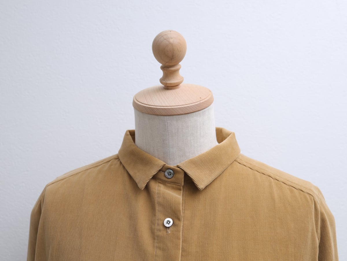 目をぎゅっと詰めて織ったコール天生地は、ふっくらやわらかい落ち感がありカジュアルながら端正なたたずまい。温かい雰囲気で人気のマスタードカラーは京都在住の染色家の手を借りて制作したオリジナルカラーです。スタンダードなシャツながら、やや小さめ襟でかわいらしさを感じる一枚は、さっと羽織るだけで深まる季節をお楽しみいただくことができます。