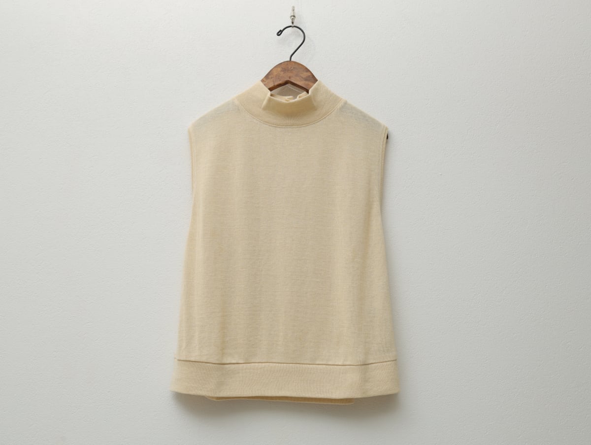 綿100%だけど、麻のようなシャリ感のある糸<擬麻(ギマ)コットン>の編地で仕立てたベストです。気になる胸をすっぽり覆いつつ、すっきり美しく見せる「日々」のパターンで安心の着心地。秋のはじめはインナーまたは袖なしトップスとして、また涼しくなってからはベストとして重ね着もお楽しみいただけます。