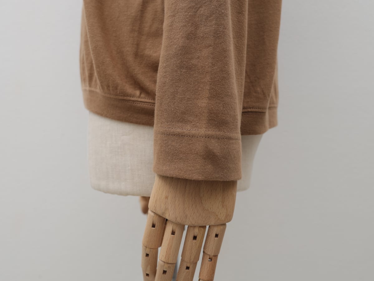 昭和初期の吊り編み機をつかって和歌山で編んだ編み地は、型くずれしにくくてやわらかな風合いが特徴です。ウエストラインを表現するために施されたかくれたダーツ処理、気になる腰回りをゆったりカットした大人のパターンの、着心地のちがいをお楽しみください。