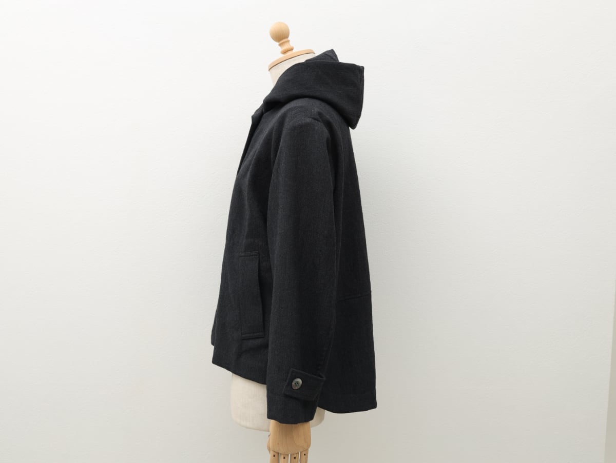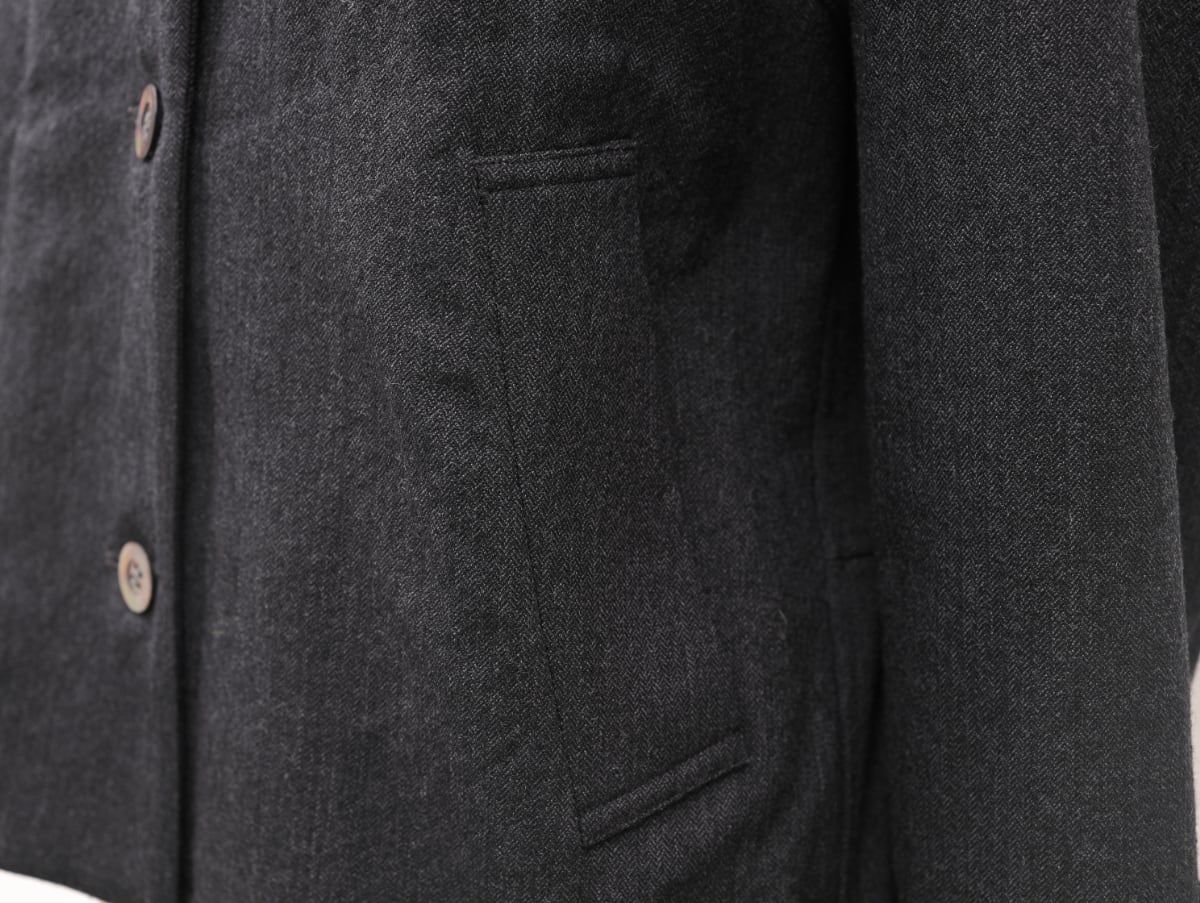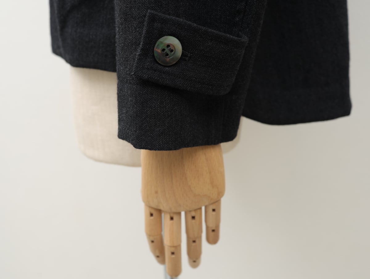 ジャケットなどに使われる光沢のある糸、羊毛を梳いた(梳毛<そもう>糸)を使って織ったヘリンボン生地は、独自レシピの洗い加工でこなれた風合いに仕上がりました。カジュアルなデザインながらきちんと感のある布で、幅広いシーンで活用できます。また袖部分は裏地付き、身頃は一重の仕立てなので、冬を待たず秋から羽織っていただくのはいかがでしょうか。