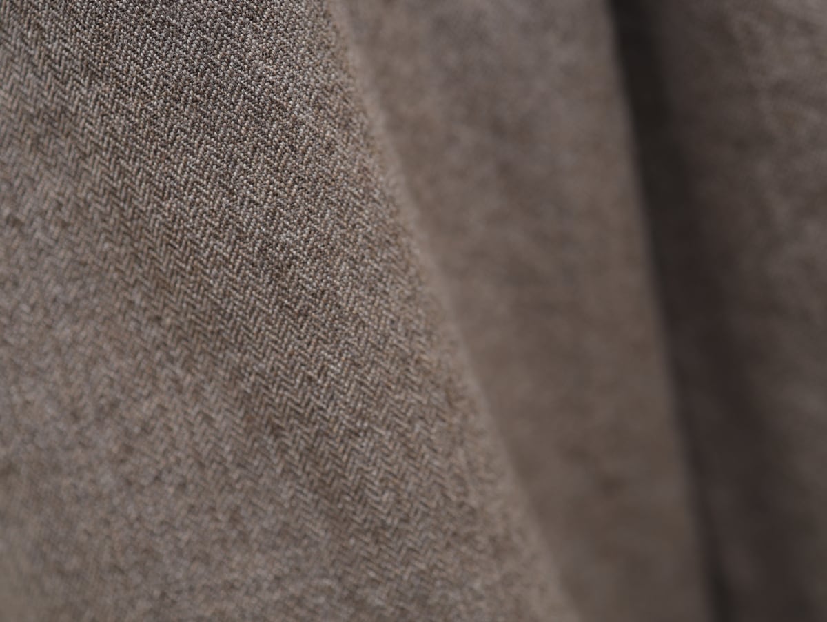 ジャケットなどに使われる光沢のある糸、羊毛を梳いた(梳毛<そもう>)を使って織ったヘリンボン生地は独自レシピでこなれた風合いに仕上がりました。「ゆったりしててラクチン」と人気のパターンで仕立てたスタンダードなワイドパンツは、丈夫な上質素材で仕立ててあるのできちんとしたい場面も、ちょっとした日常のシーンもリラックス気分でお楽しみいただけるのではないかと思います。