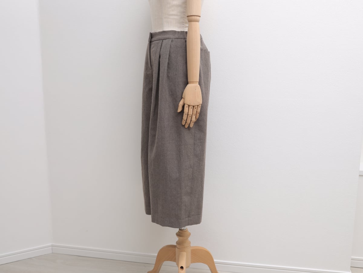 ジャケットなどに使われる光沢のある糸、羊毛を梳いた(梳毛<そもう>)を使って織ったヘリンボン生地は独自レシピでこなれた風合いに仕上がりました。前面に取った2本の深いタックでキュロットのような履き心地ながら裾がすっきり見える工夫で、小柄さんにも似合うワイドパンツ。丈夫な上質素材で仕立ててあるから、きちんとしたい場面も、ちょっとした日常のシーンもほんのりやさしい大人ナチュラル気分をお楽しみいただけるのではないかと思います。