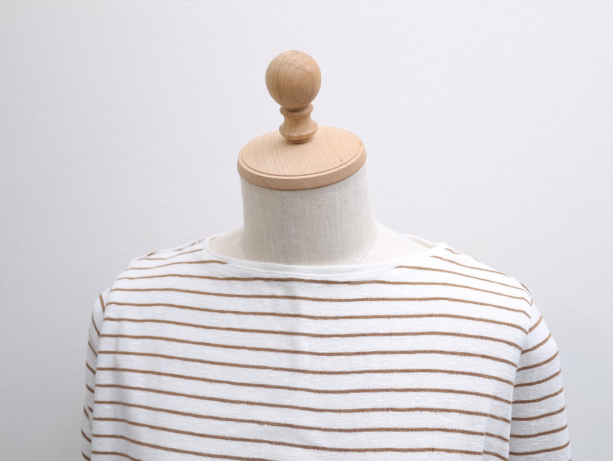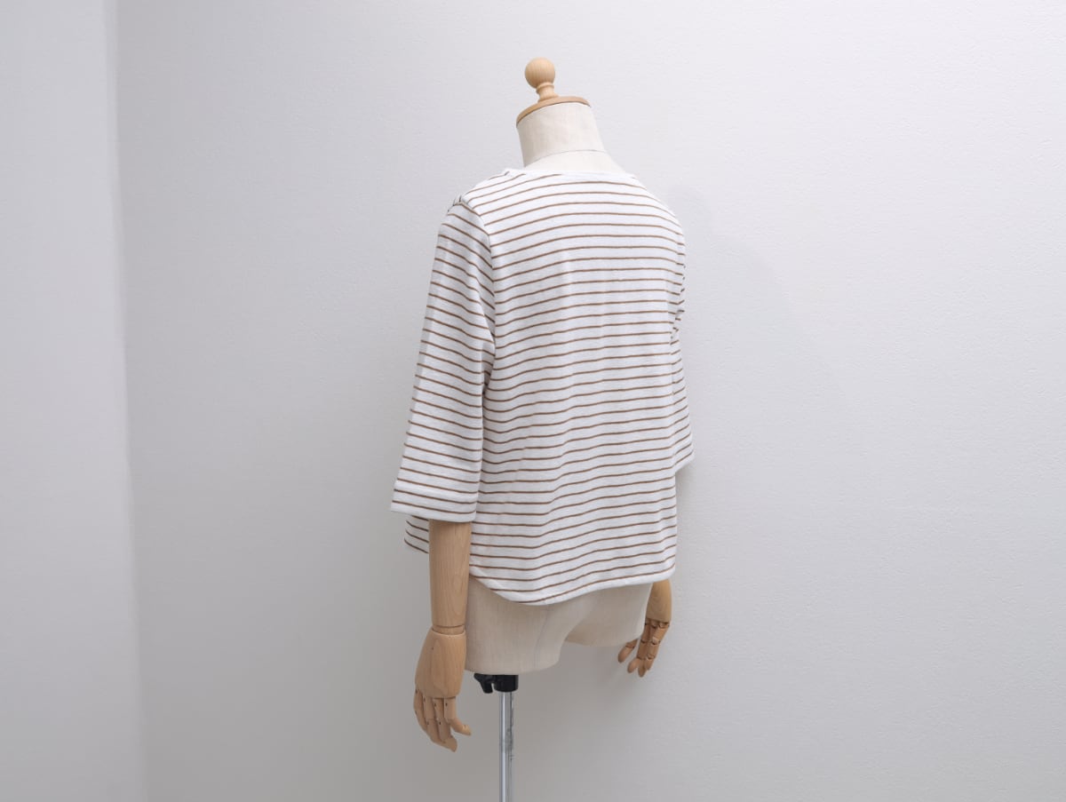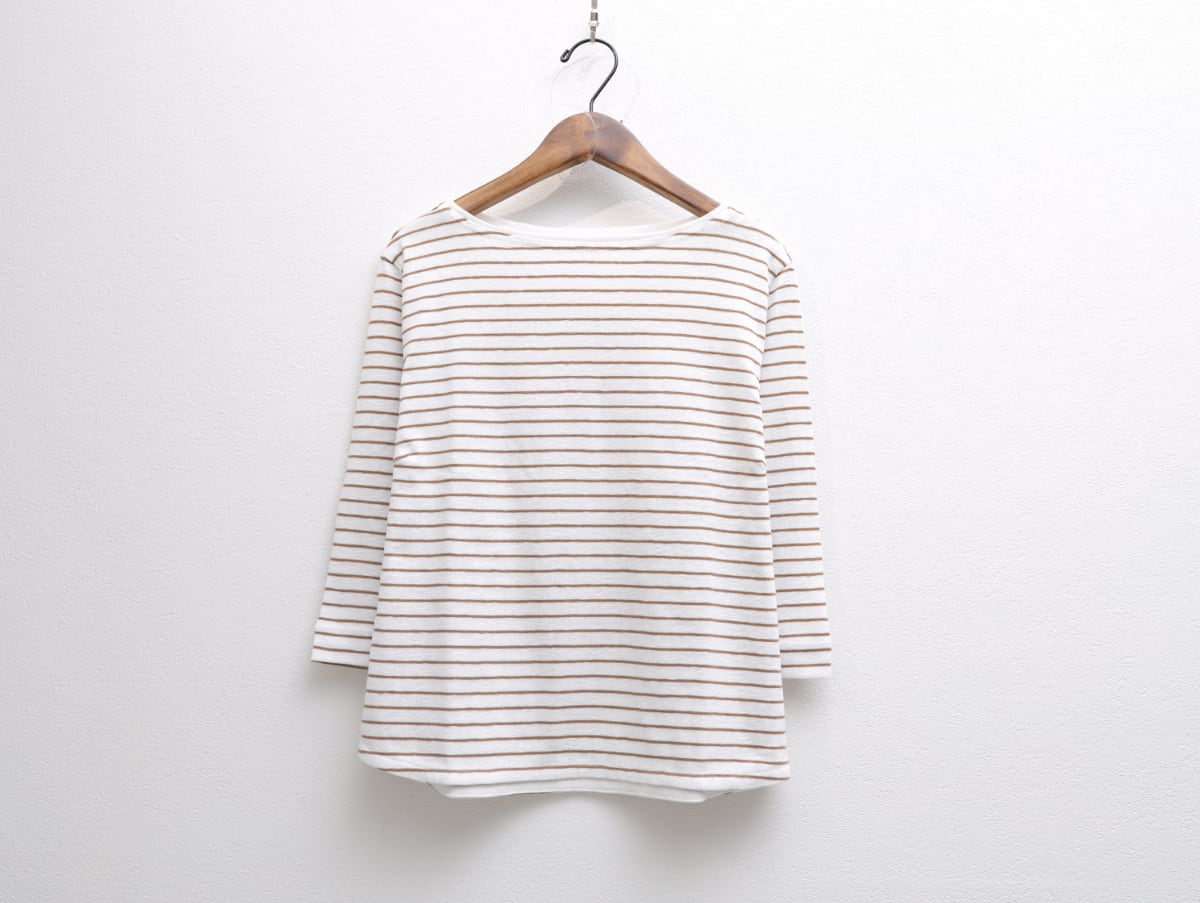 大人の素肌になじむようスラブ糸で編んだボーダー地は、柔らかさがとっても気持ちいい人気のオリジナル。春から活躍する袖丈と、丁寧にカットしたボートネックが軽やかで使いやすい、お客様のご要望からパターンをひいた新作七分袖です。