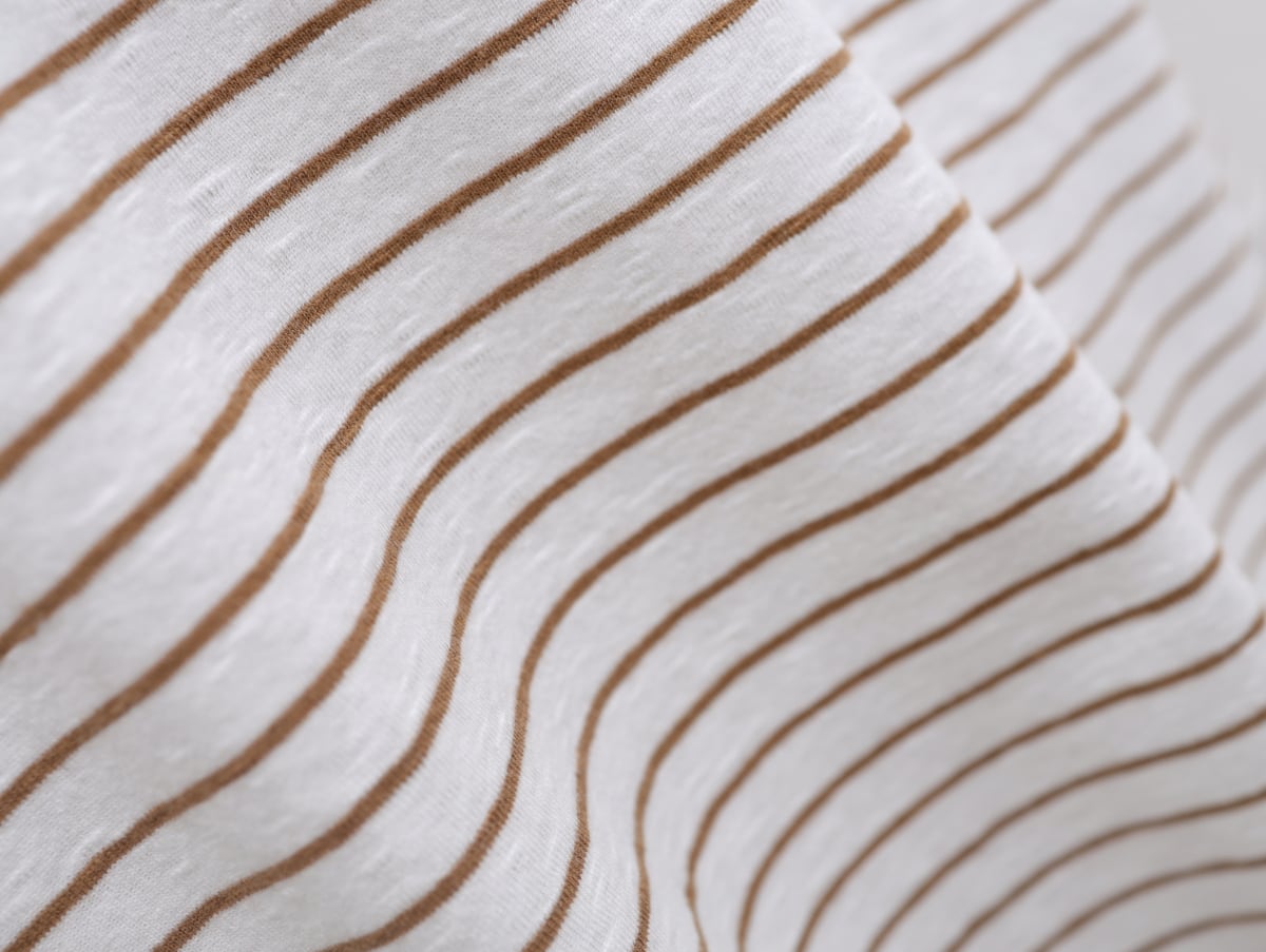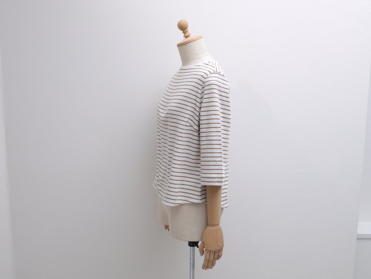 スラブ天竺ボーダーの七分袖プルオーバー c/#キャメル×白