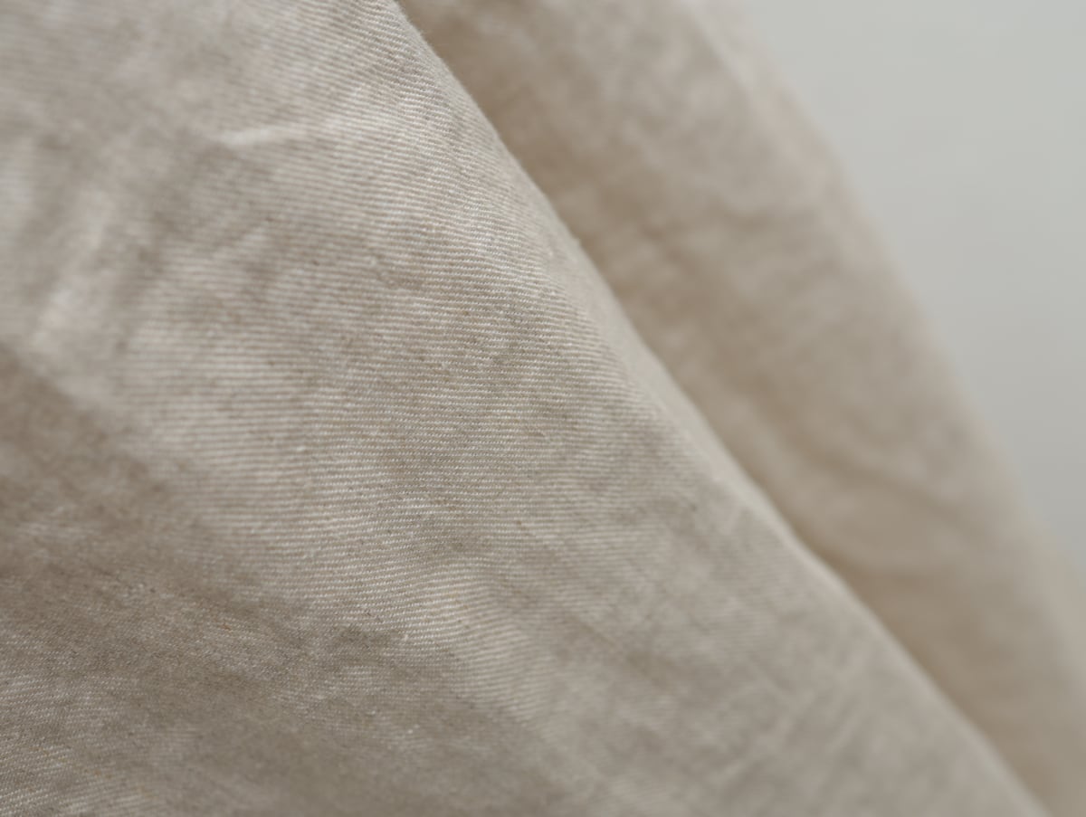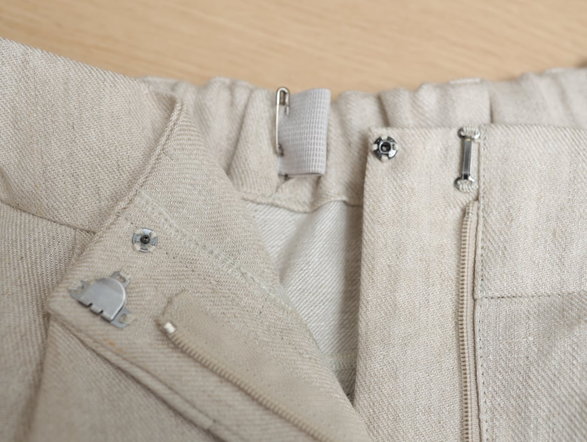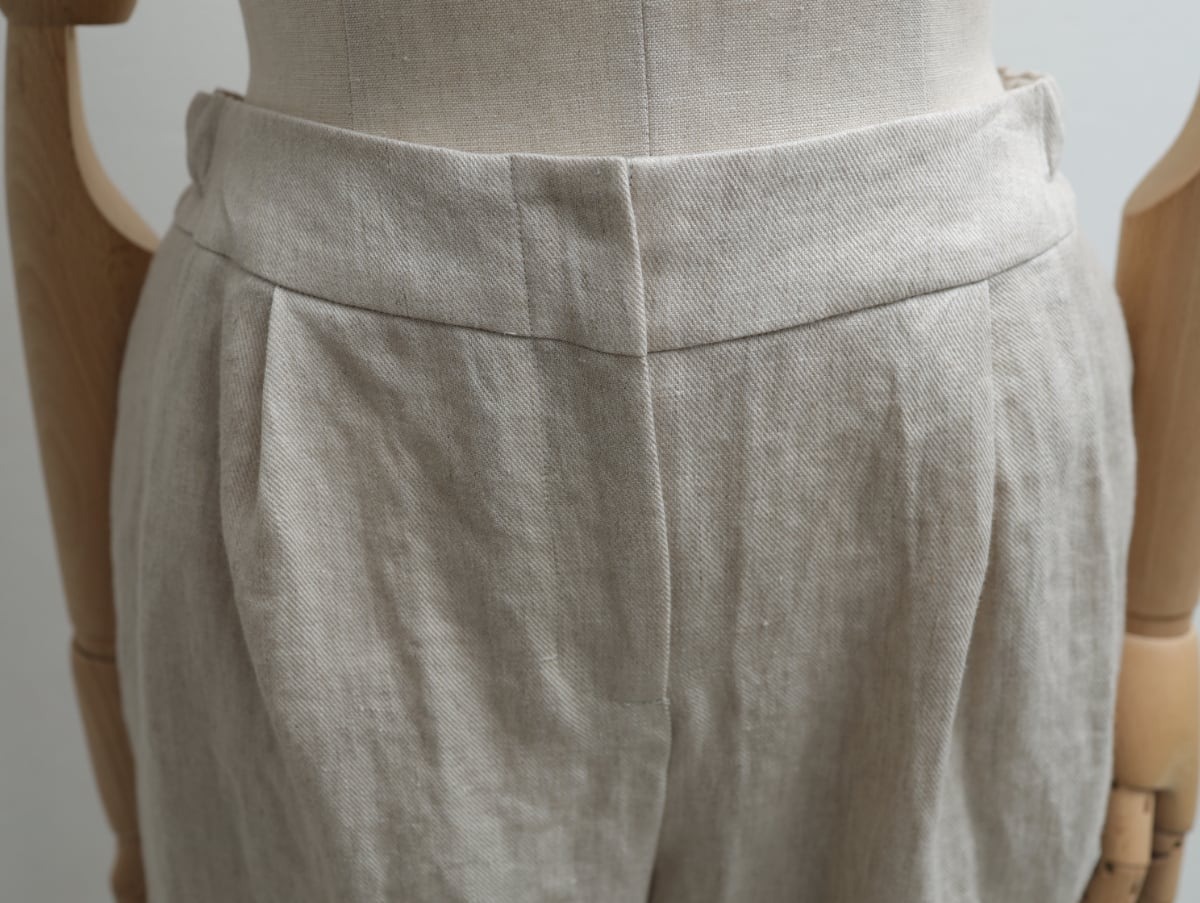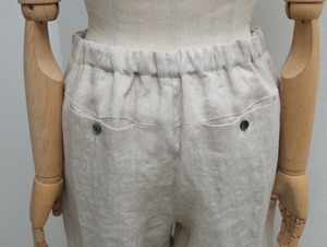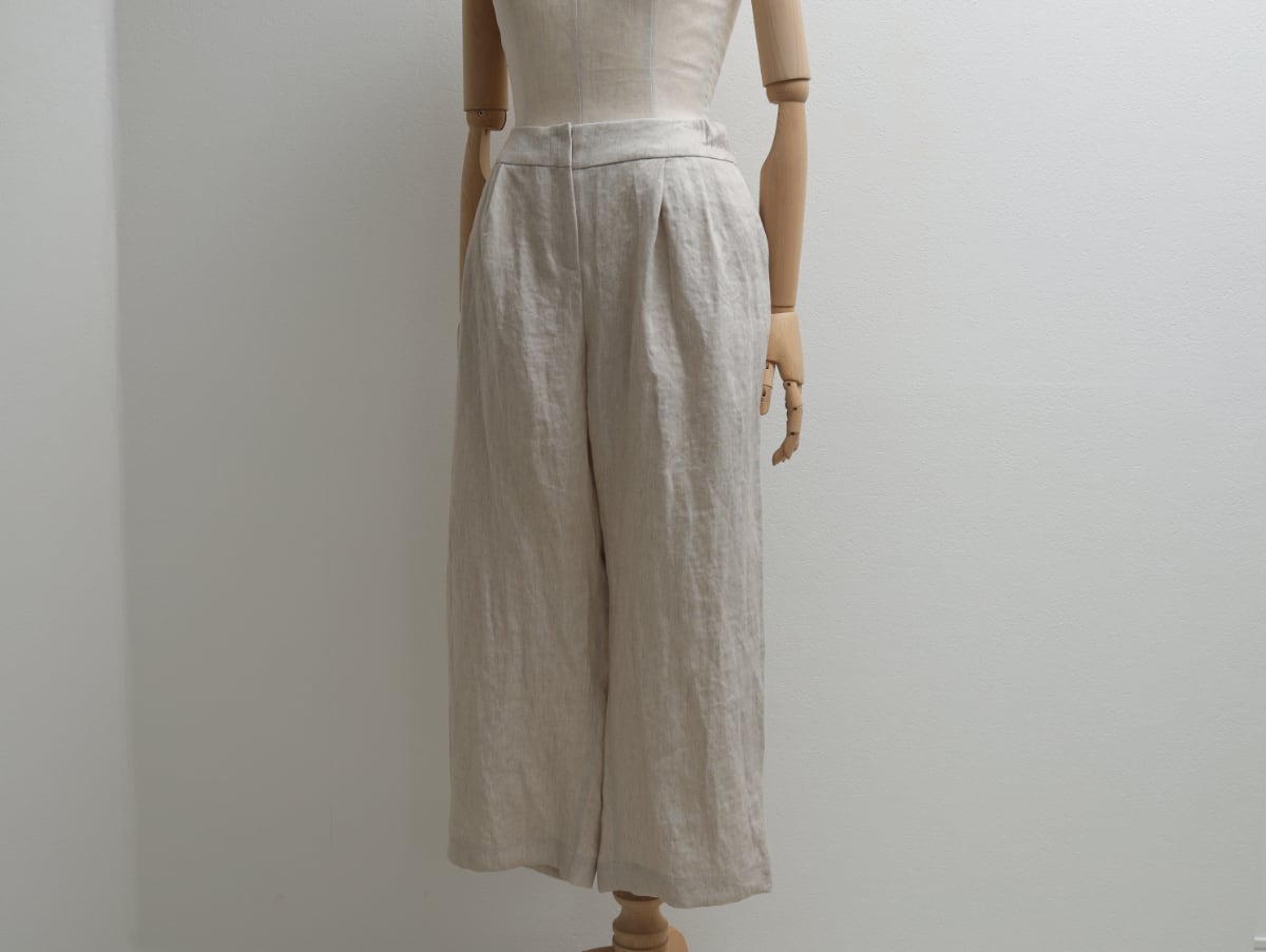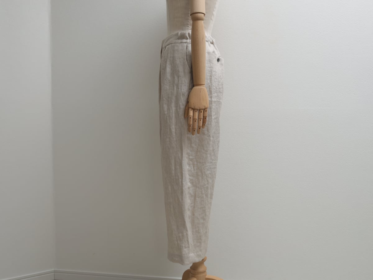 紡績からはじまった歴史ある麻メーカーが作る綾織り生地は、洗い加工によって繊維がゆるみ柔らかい印象に仕上がっています。脚のラインをきれいに見せる工夫がつまった繊細な大人のパターンで、ワイドパンツが苦手…という方にもぜひお試しいただきたいと思います。
