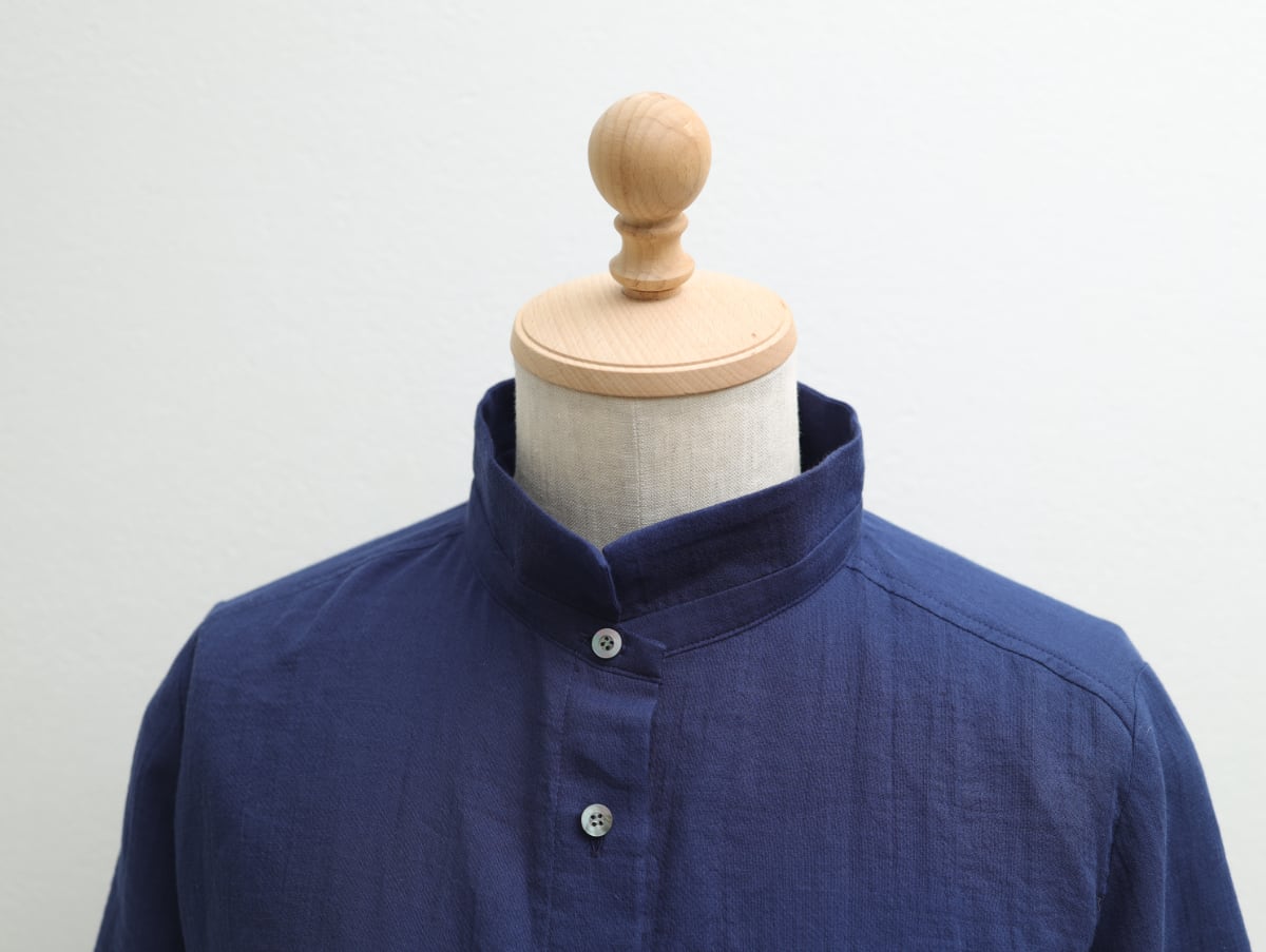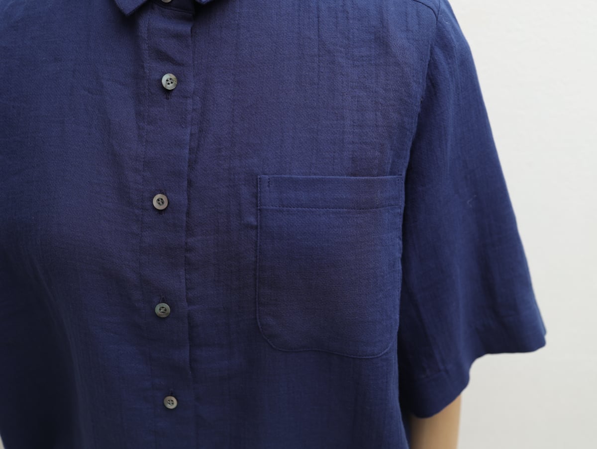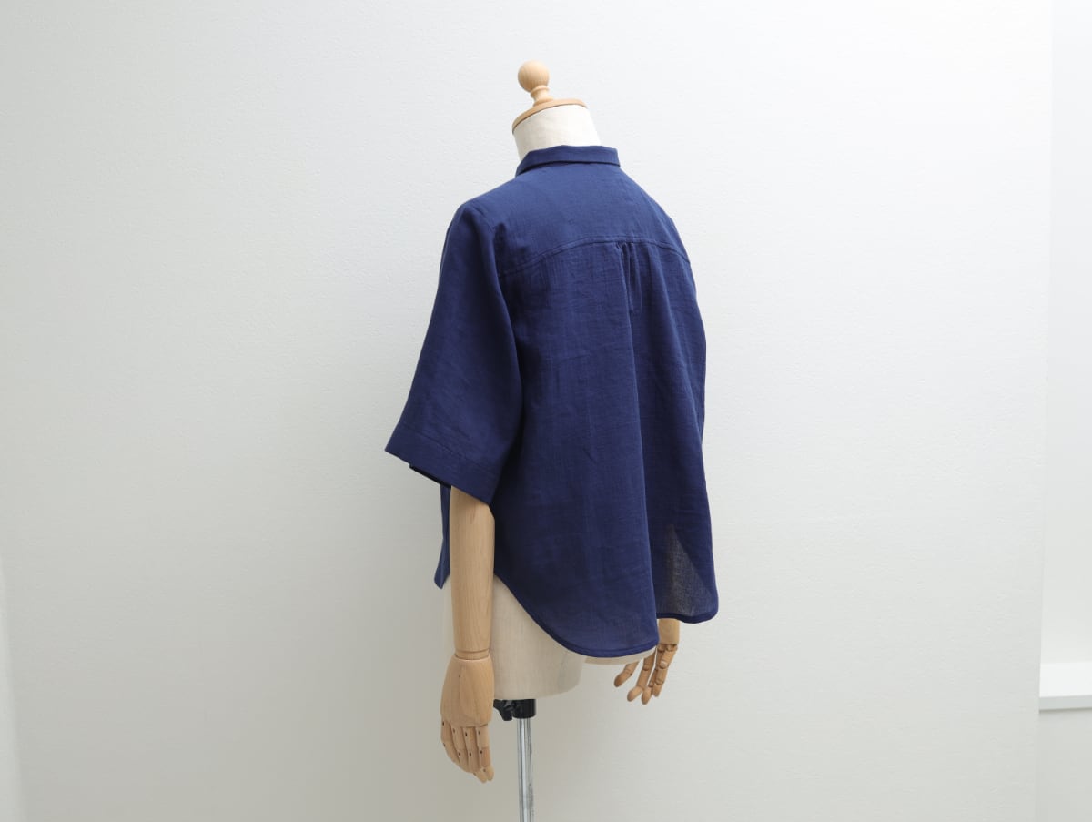 ガーゼ素材の中ではめずらしい細番手の糸で織られた生地は、絞るように晒して染める工程によって、素肌にやさしいほっこりしなやかな風合いに仕上がりました。オーバーサイズながら二の腕が隠れてすっきり見える袖丈が、夏にぴったり健やかさを感じてほしい一枚です。