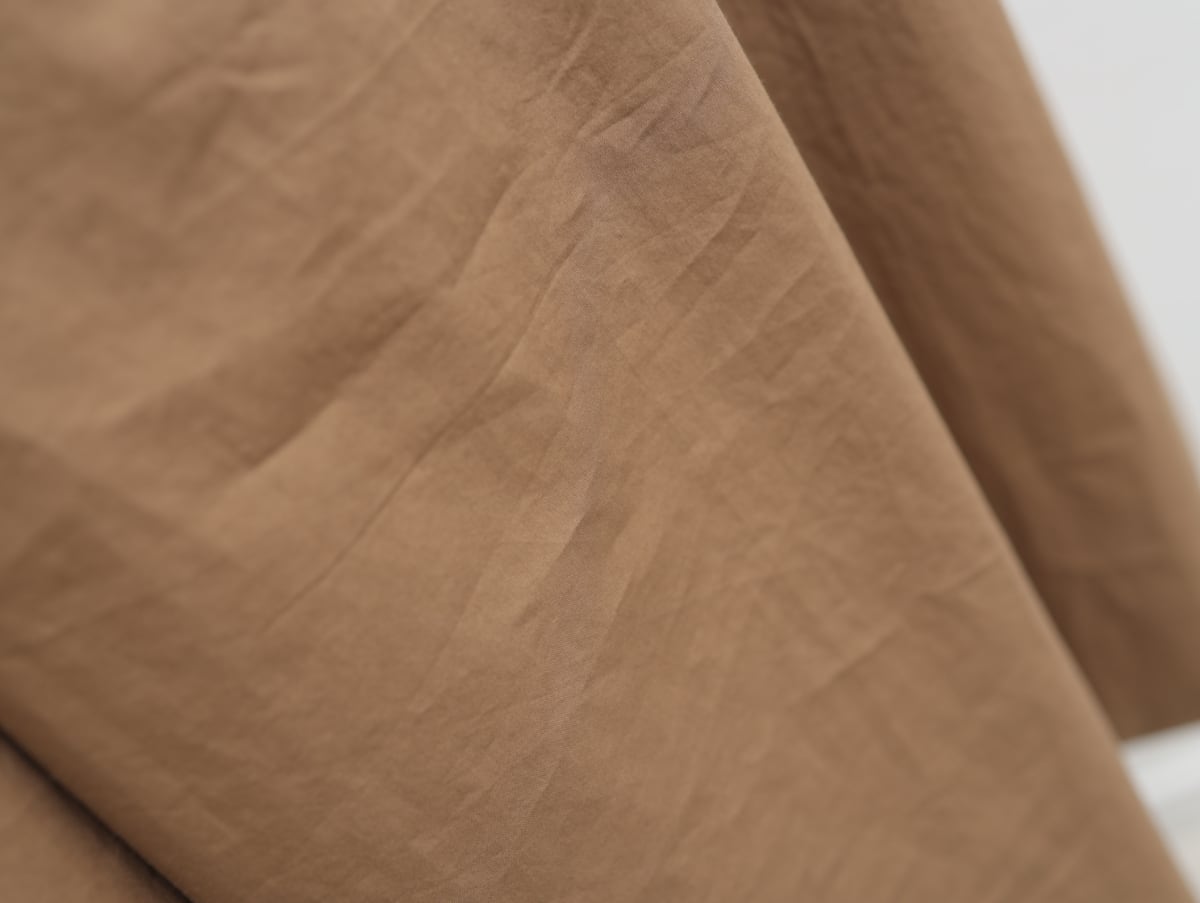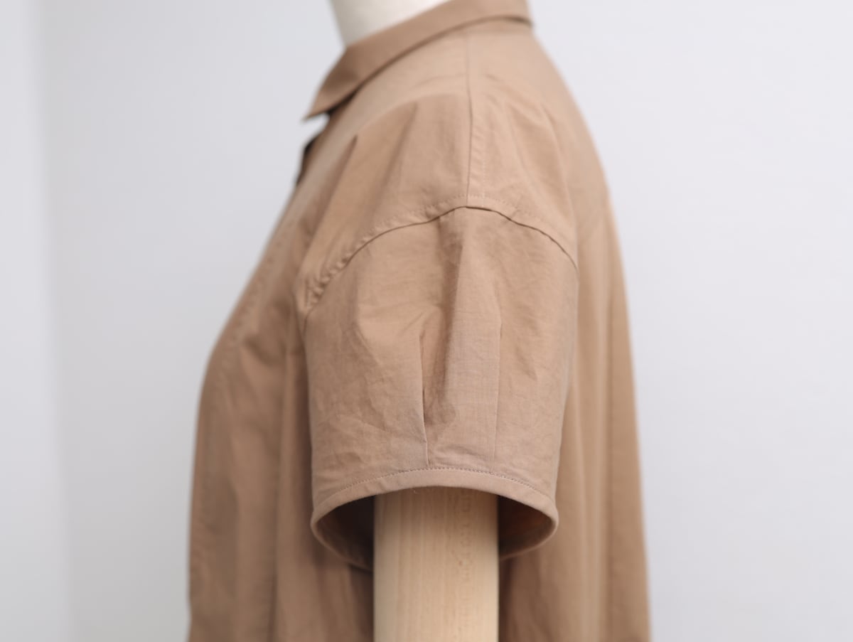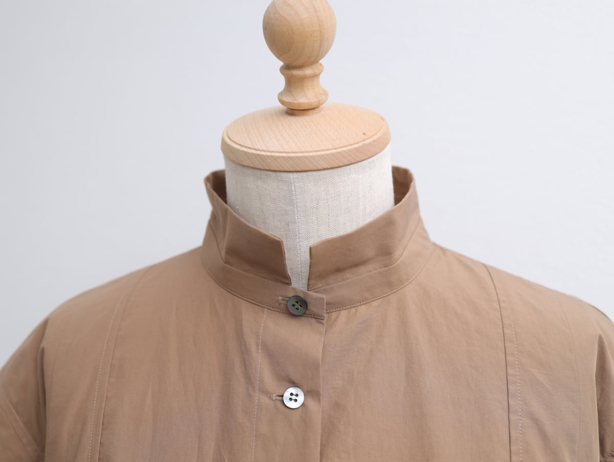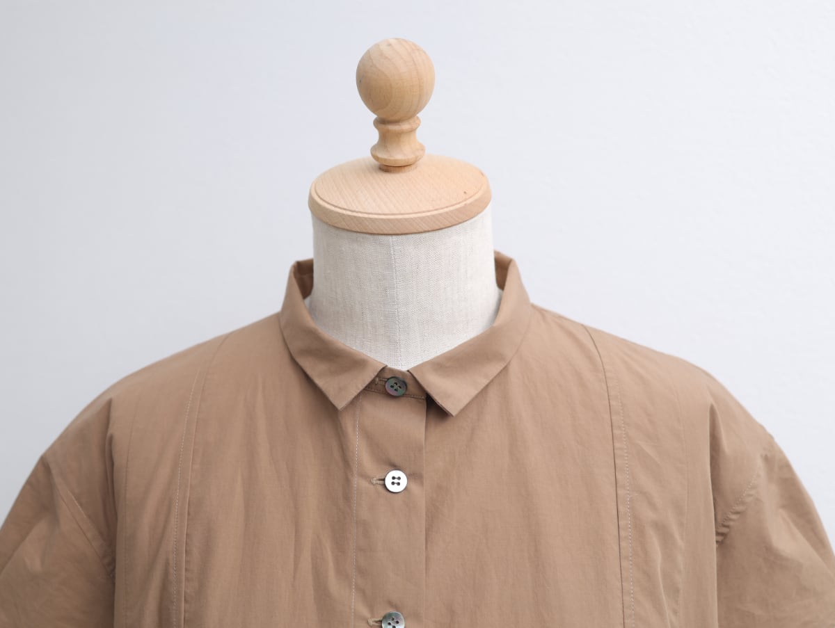 動きにつれてカサッとわずかな音が生じることからサウンドタイプライターと名付けられた布は、張りがあるのにしなやかな落ち感が魅力ポイントです。ほんのりパフの繊細なカットを施した袖口は大人キュートな気分をお楽しみいただける新型。ヘムラインがふんわりゆれるシルエットに、ほんのり女性らしさが香ります。