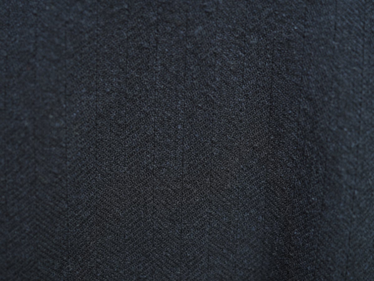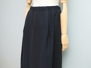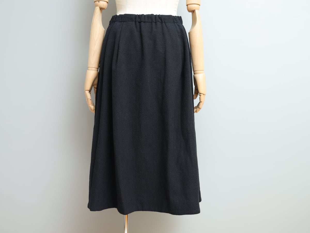 絹の落ち綿にウールと木綿を合わせたヘリンボン変わり織りで仕立てたスカートは、しっくり落ち着いた素材感でちょっぴりお出かけの雰囲気に仕上がっています。横から見ると平坦ではなく背のアーチを感じるタック効果と、少し短い着丈でブーツスタイルも軽やかに映えます。